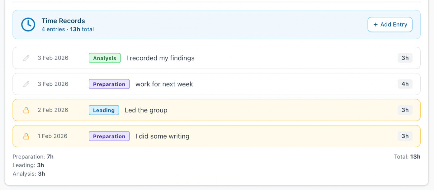 Amikor kiválasztja a kék Időrekordok gombot, az információ megjelenik alatta. Az eszköztár tetején megjelenik a rekordok száma és a rögzített órák összege. Minden rekord megmutatja a megadott dátumot, a tevékenység típusát, a leírás vagy a jegyzetek rövid leírását és a rögzített időt. A zár ikonnal megjelenő rekordok már nem szerkeszthetők. Nincs törlés, de csak szerkesztheti az összes mezőt új értékekre, vagy megadhatja az időt 0 órára. A jobb felső sarokban található egy gomb új bejegyzés hozzáadásához.